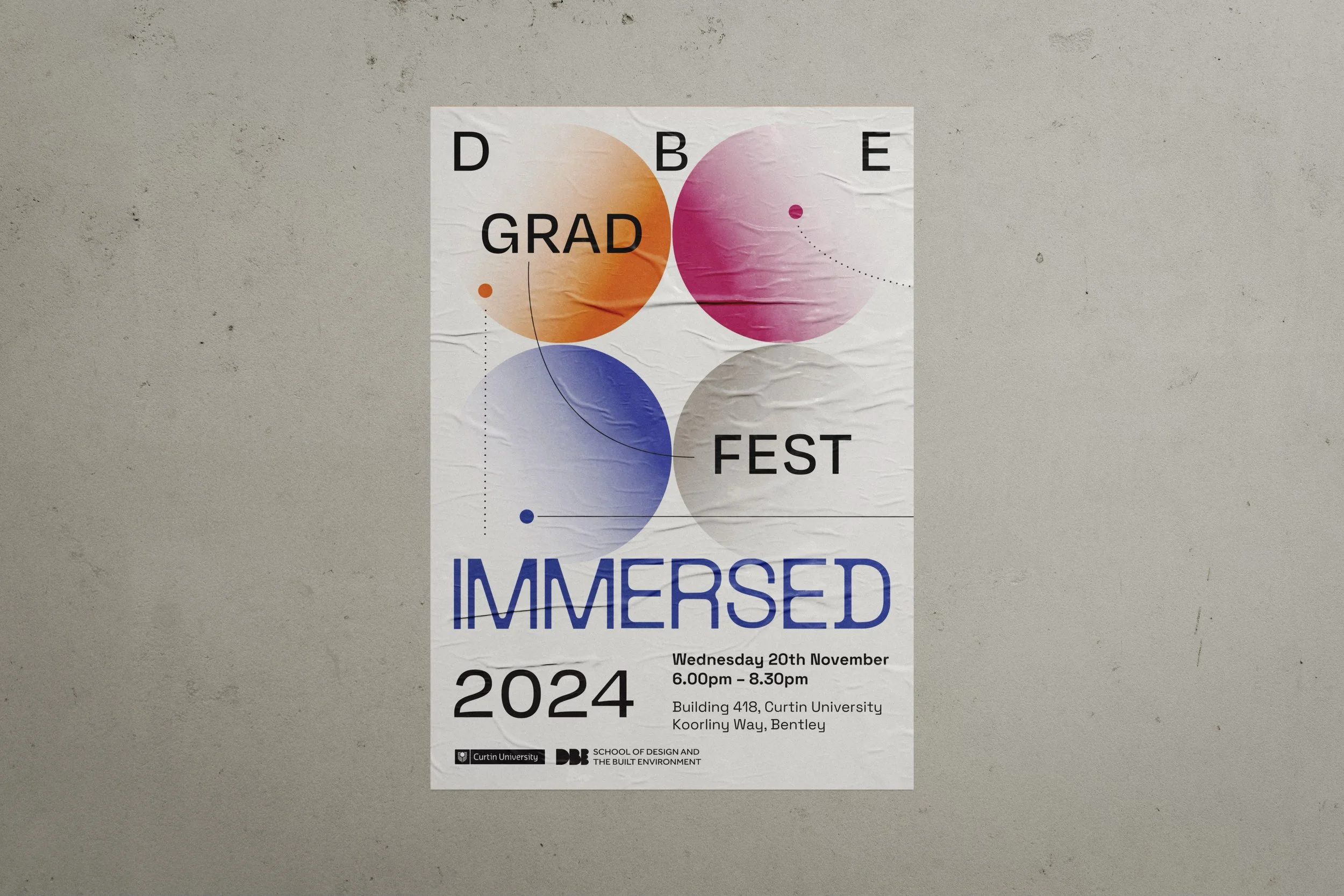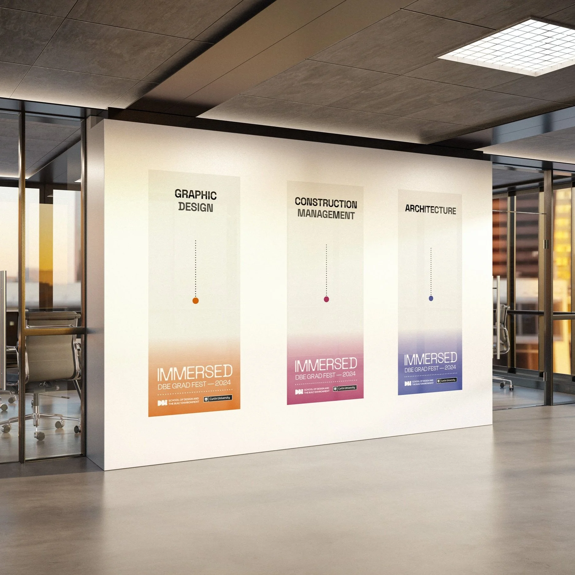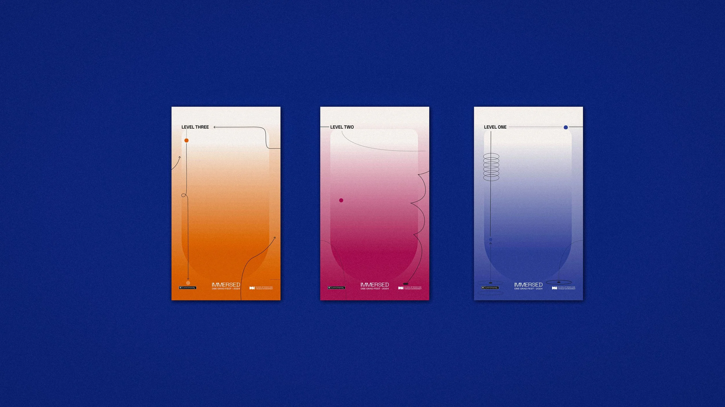 The branding concept "Immersed," created for the 2024 Curtin Design and Built Environment Graduation Show in collaboration with Sophia Thomas, invites audiences to engage deeply with student achievements. Each building level showcases a gradient symbolising the journey through disciplines, with each faculty represented by its own shade, visually unifying and celebrating collaboration. The brand emphasises depth and discovery through clean, minimalist design elements, gradients, and dotted lines that guide the audience through the exhibition. Its modern and warm aesthetic appeals to both industry professionals and students, while rounded forms represent diving and depth, emphasising the exploration of student talent and celebrating innovation.