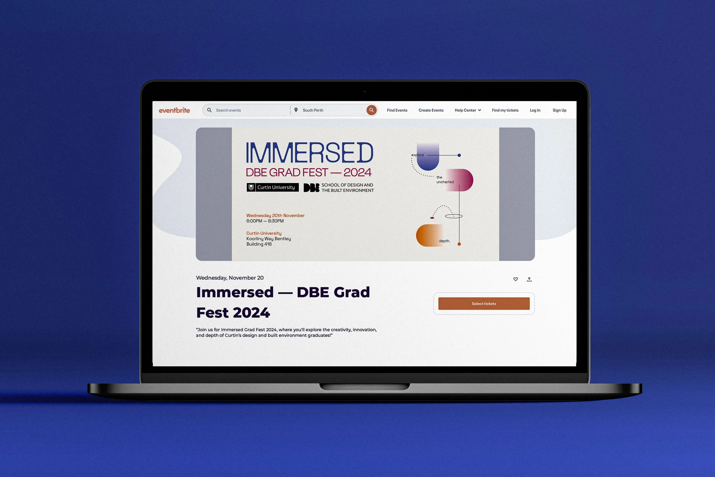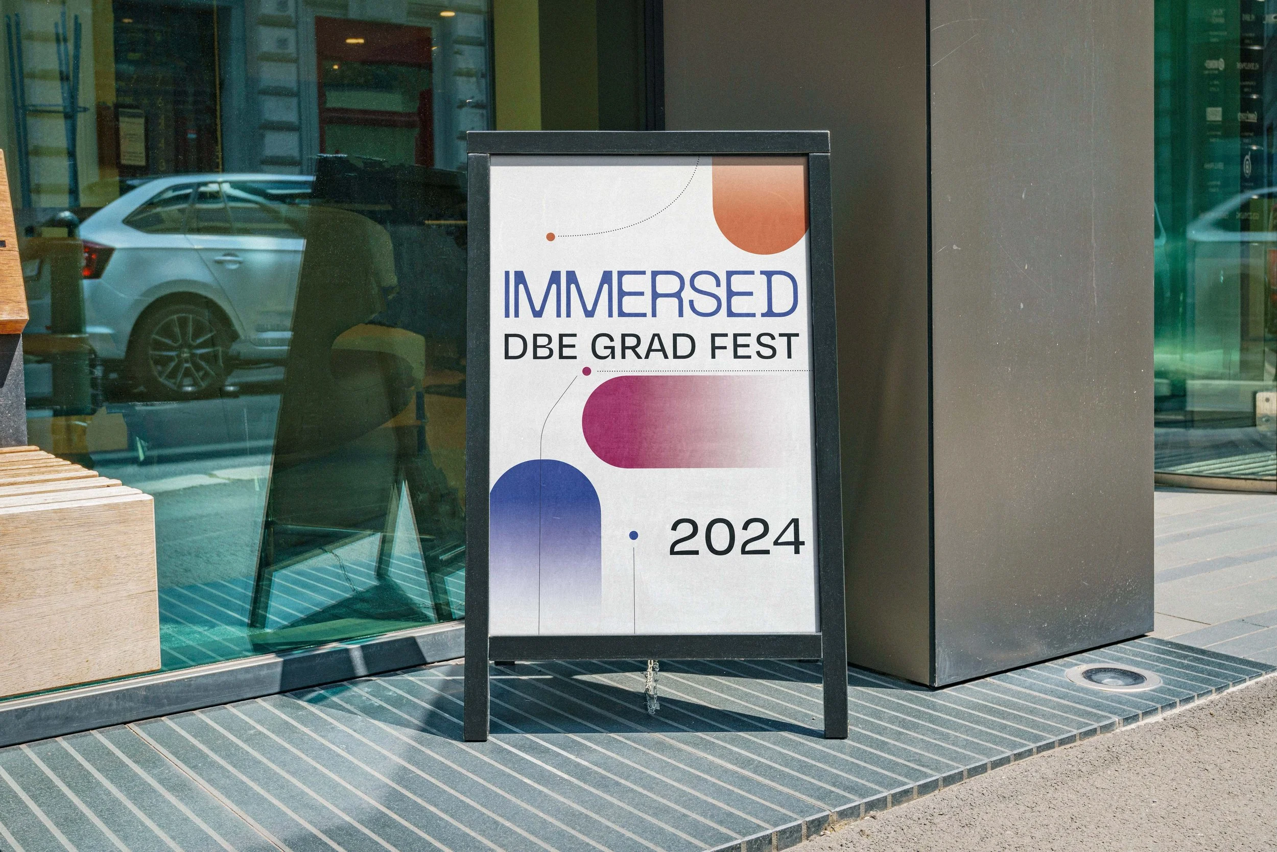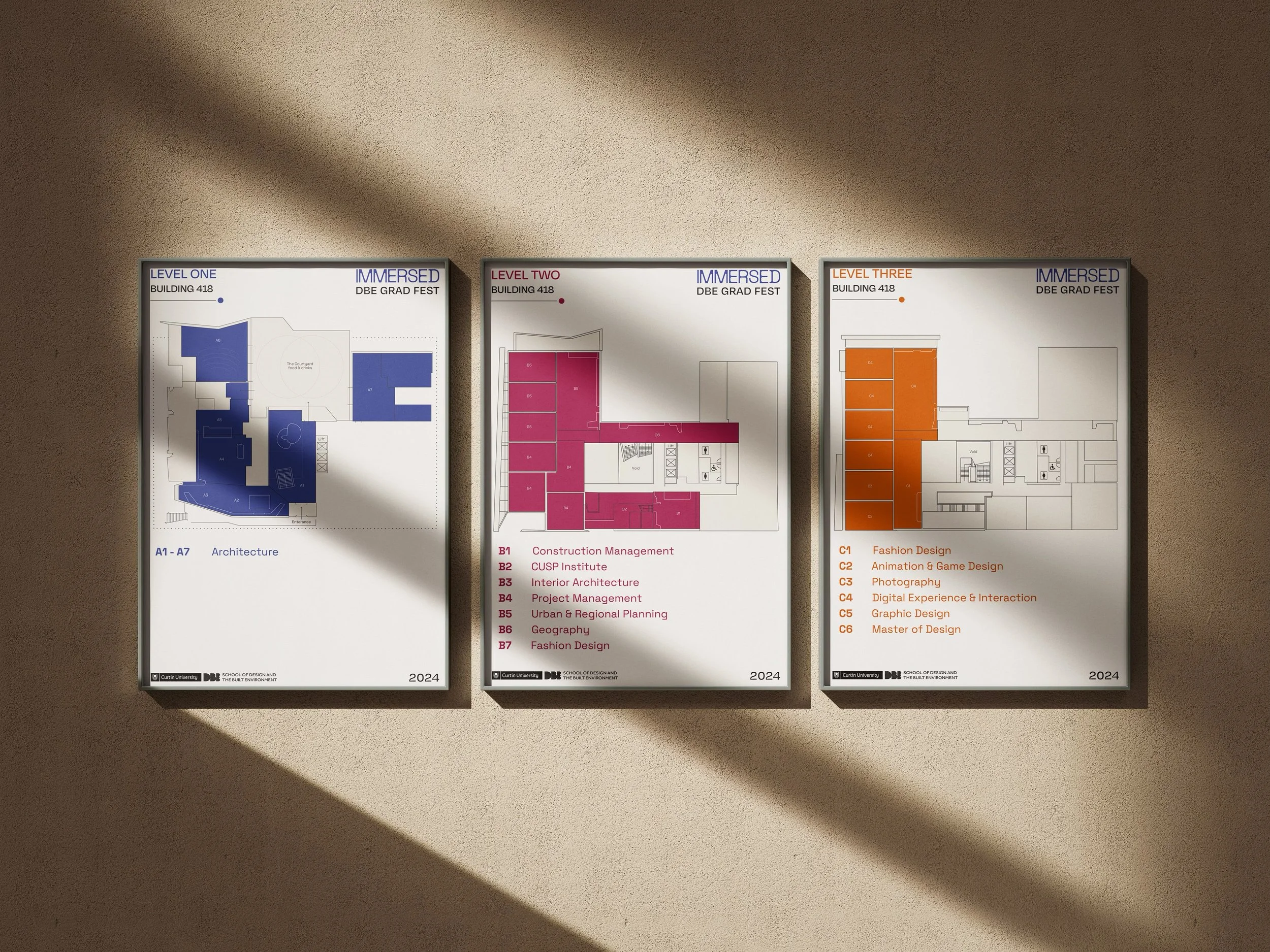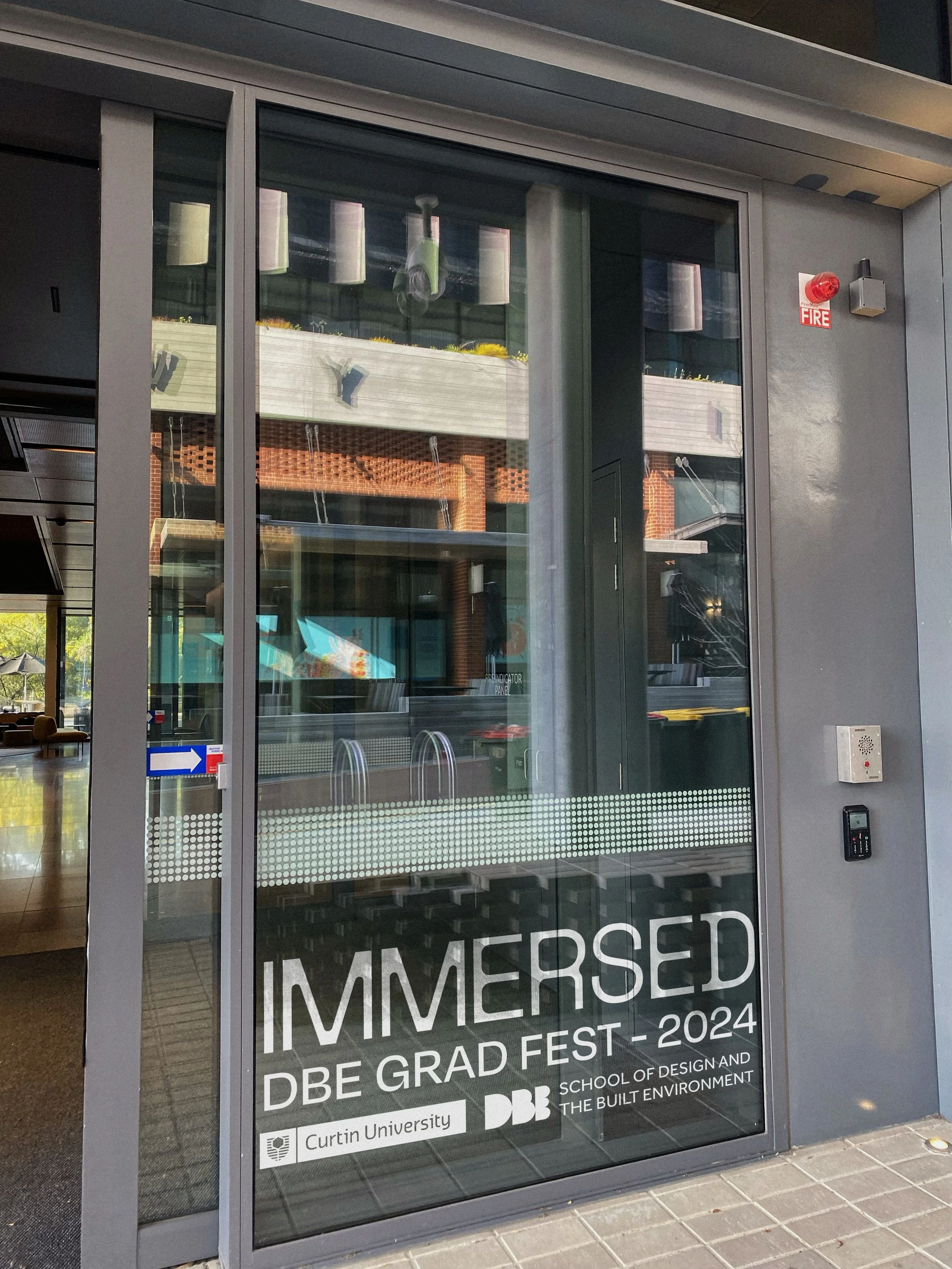 The branding concept "Immersed," created for the 2024 Curtin Design and Built Environment Graduation Show in collaboration with Sophia Thomas, invites audiences to engage deeply with student achievements. Each building level showcases a gradient symbolising the journey through disciplines, with each faculty represented by its own shade, visually unifying and celebrating collaboration. The brand emphasises depth and discovery through clean, minimalist design elements, gradients, and dotted lines that guide the audience through the exhibition. Its modern and warm aesthetic appeals to both industry professionals and students, while rounded forms represent diving and depth, emphasising the exploration of student talent and celebrating innovation.